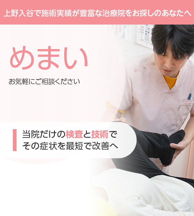 通いやすさも改善のためには重要なポイントです。日比谷線入谷駅とJR山手線鶯谷駅の2駅利用できる好アクセスです。また土日祝と受付しており、予約制ですのでプライバシーを確保しやすく、お待たせする事もありません。