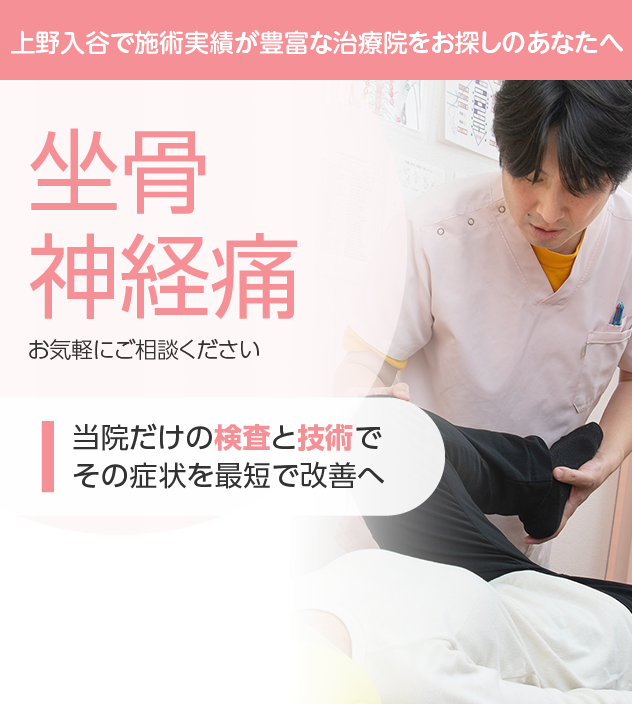 病院やほかの治療院で改善しなかったとしても諦める必要はありません。坐骨神経痛は豊富な施術実績を誇る当院にお任せください。